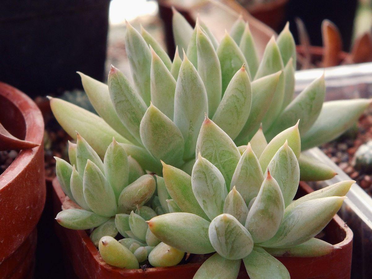 La Stapelia grandiflora es una planta que desarrolla tallos tubulares con los márgenes dentados y verdes que pueden llegar a medir entre 10 y 15 centímetros de altura. Las flores son, como su apellido indica, grandes y brotan en verano. De hecho, miden unos 20-30 centímetros de diámetro y son de color lila. En el margen de sus pétalos tiene numerosos pelillos blancos y suaves. Por ser muy sensible a las bajas temperaturas, es necesario que se tenga en casa durante el invierno.x Pachyveria glauca