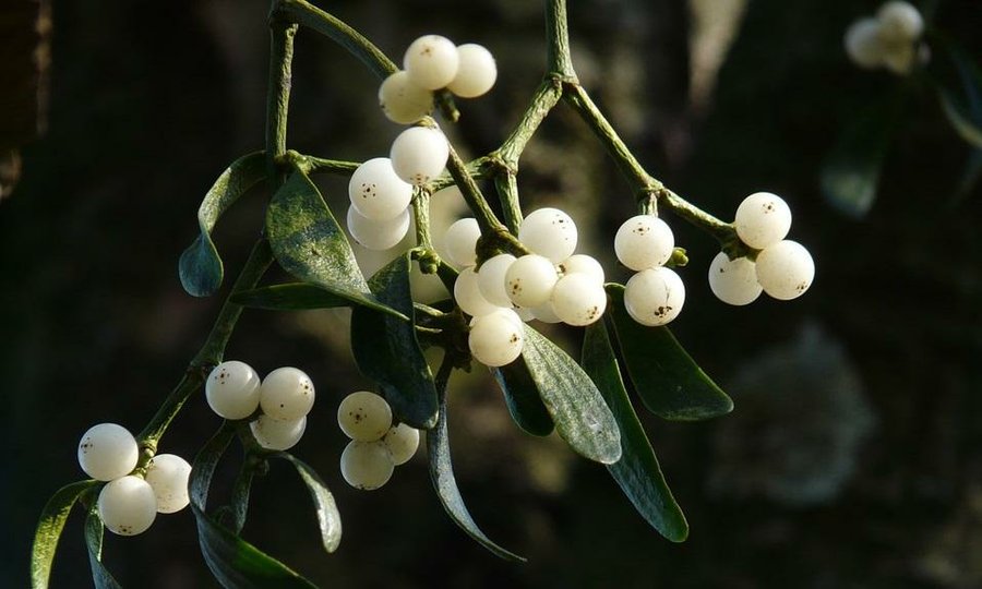 En tercer lugar está esta otra planta semiparásita perteneciente a la familia de las santaláceas, nativa de Europa, Asia y América. Se le considera un amuleto de buena suerte e inunda mercados navideños alrededor de todo el mundo. Suele confundirse con la primera, el acebo, pero son bien fáciles de distinguir ya que sus frutos son verdes y no rojos, como uvas. Además, son más pequeños.