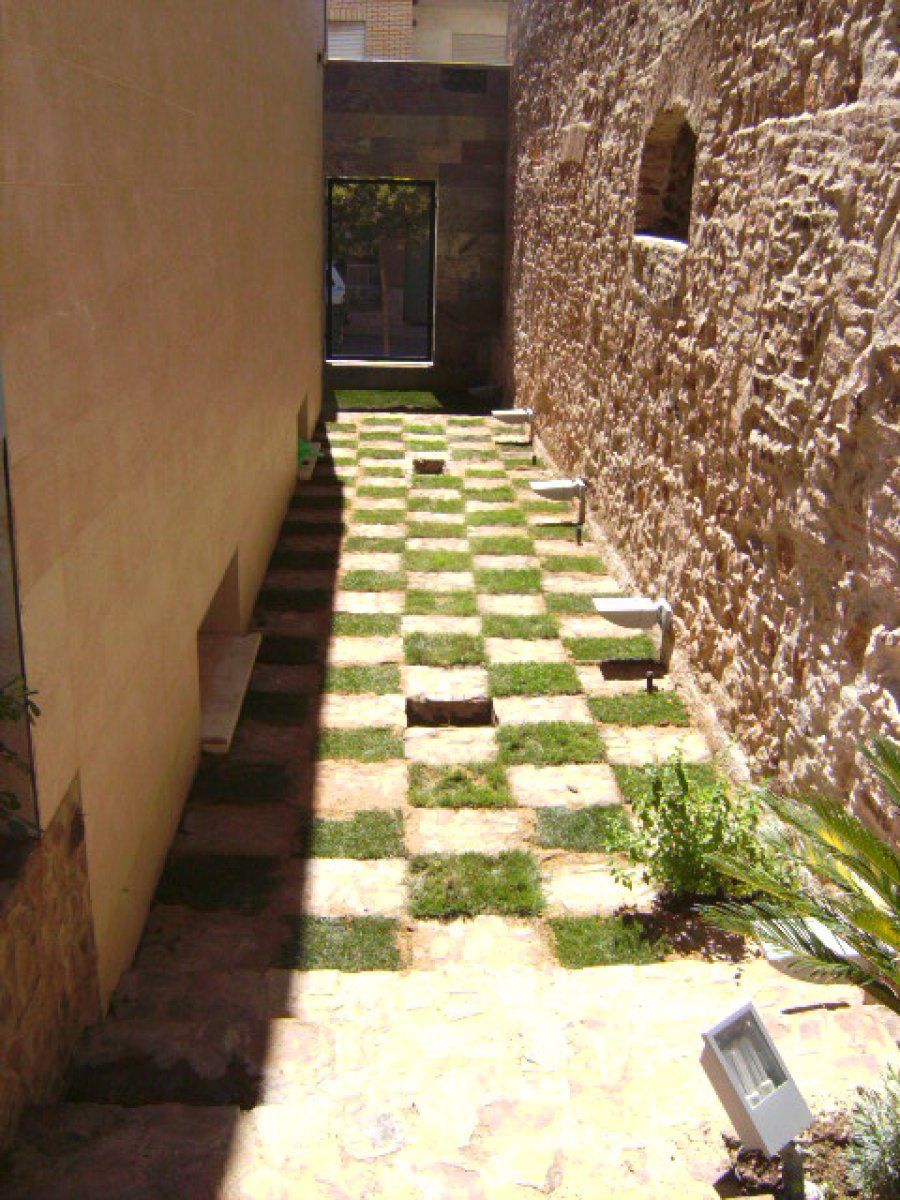 En el caso que os presentamos, El Estudio de Paisajismo Ruiz Dyezma, lo tuvimos difícil porque el loft, hacía medianería con algo tan clásico como es la histórica iglesia del municipio donde se encontraba, al final, quedó resuelto sólo con césped dispuesto en damero y unas sencillas macetas.