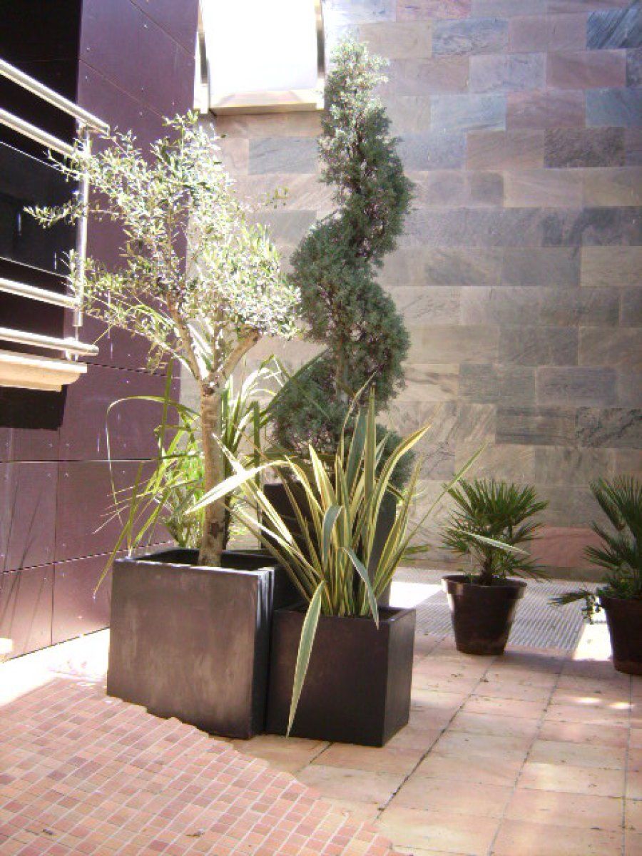 Conjunto de macetas cúbicas. Son de diferentes tamaños, también en resina negra, creando una composición en contraste de formas vegetales.