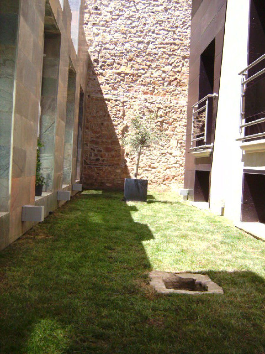 Un lateral complicado. Resultó la zona más conflictiva a ajardinar pues en ella convergían dos estilos arquitectónicos totalmente yuxtapuestos, el muro de una iglesia del siglo XVI y la arquitectura del loft que describimos. Lo resolvimos con este geométrico y limpio damero de césped. Al final perspectiva frontal de los ventanales acristalados que definen este espacio.