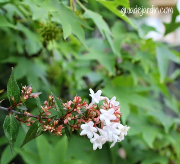 Recuerdo que la abelia os la enseñé hace días, cuando se formaban los capullos y el arbusto empezaba a coger su característico tono rojizo. Ahora las flores ya se abren y forman grupos de campanillas blancas en los extremos de las ramas. Al fondo un liquidambar, las dos plantas están en macetones grandes sobre la terraza.
