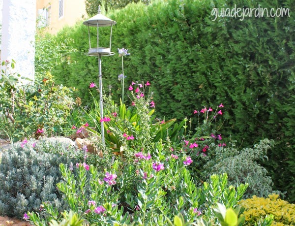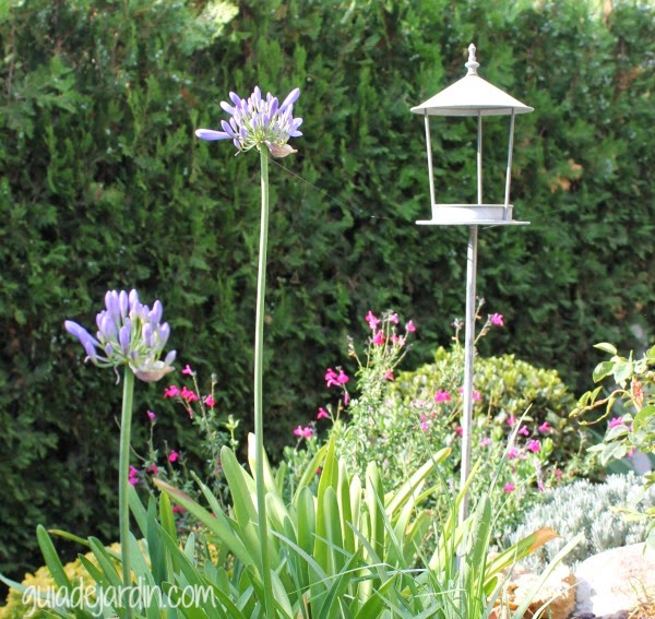 Los agapantos del jardín se han abierto, pero en lugar de las 10 varas que llegaron a salir el pasado verano, este año sólo han aparecido 2. En cambio, los que tengo en la terraza han florecido los 4. En la foto los dos del jardín junto al bebedero para pájaros que he puesto este año. Y... ¡SI! se acercan a beber..., lo complicado es hacerles fotos.