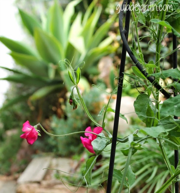 Aquí se ve el ágave al fondo, la foto está hecha desde el otro lado. Las flores son del guisante de olor que, en mi caso, parece que sean las últimas de la temporada. Se está llenando de vainas con bolitas en su interior y los tallos se están secando. En esta entrada hablaba sobre ellos.