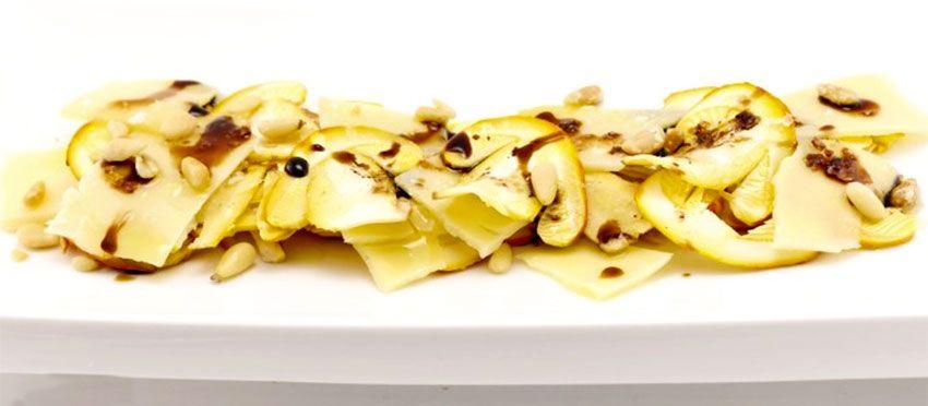 Decoramos con los piñones, las láminas de parmesano y unas gotas de aceto o vinagre de módena dulce.
