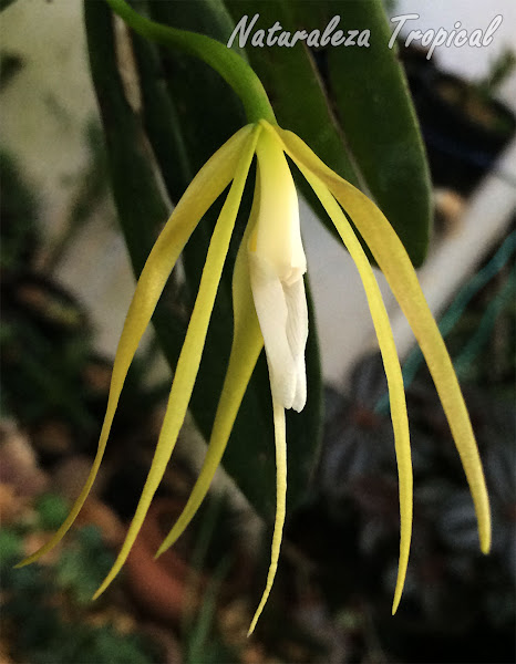 Las flores son hermosas y desprenden un aroma exquisito en horas de la noche; se disponen en pequeñas inflorescencias terminales que forman de 1-4 flores donde solo observaremos 1-2 (raro) abiertas. Estas se caracterizan por tener los pétalos y sépalos muy finos (lanceolados) siendo los primeros aún más finos. Los pétalos y sépalos miden unos +/-8 cm de largo y son de color amarillo verdoso (blancos inicialmente). El labelo es de color blanco y está formado por tres lóbulos (uno central muy fino y largo (+/- 6 cm) y dos laterales más anchos y de menor talla) La columna se dispone sobre el labelo y es blanca. Las flores de esta especie pueden llegar a no abrir en su totalidad si ocurre una polinización temprana. La polinización evita que ocurra este proceso para que comience la formación del fruto y las semillas. En las imágenes presentadas los lóbulos laterales del labelo no están expuestos debido a la polinización temprana de la flor.