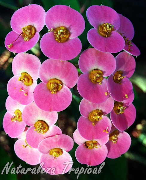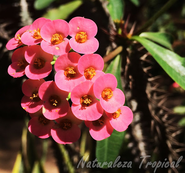 Flores rosadas de una Corona de Cristo o Corona de Espinas, Euphorbia milii