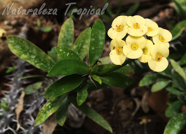 Flores amarillas de una Corona de Cristo o Corona de Espinas, Euphorbia milii