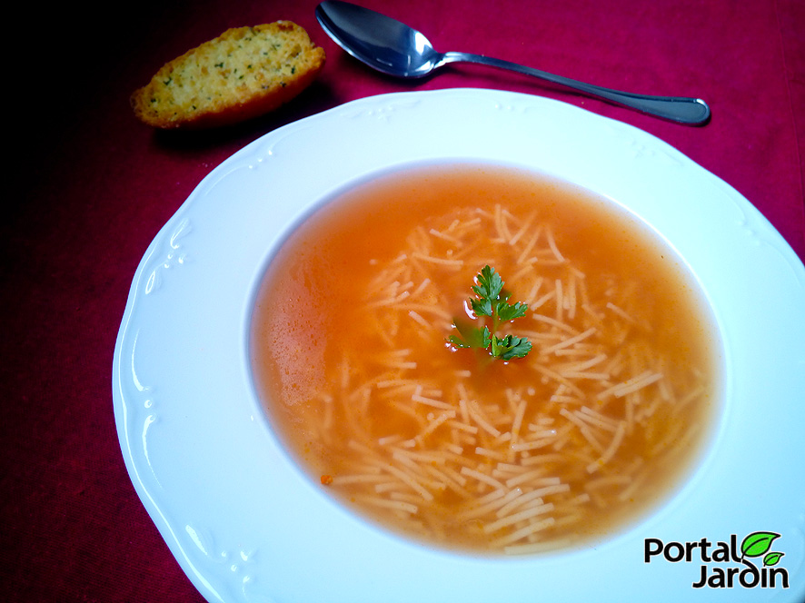 Para hacer el caldo hiervo unos 30 minutos los restos de las verduras, luego lo cuelo y me quedo sólo con el líquido. A éste le añado sal y fideos cabello de ángel o arroz. También le puedes añadir un huevo y revolver para que se rompa.