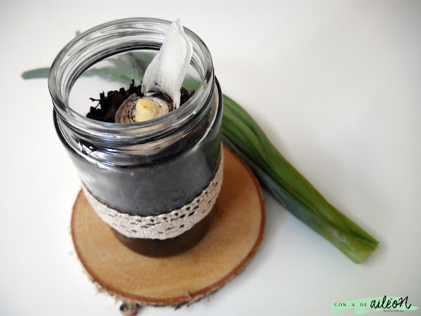 ¡Ahora hemos plantado dos puerros! porque vimos las raices que hay en la parte blanca, lo que cortamos y tiramos normalmente... así que ¡a la tierra se han ido! y reciclando botes de vidrio porque como esto "crece en vertical" lo tenía perfecto para tener uno para cada hijo, jajajaja... ya os contaré cómo evolucionan.