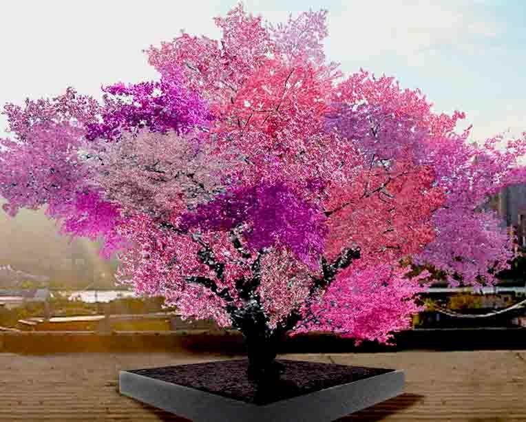 En primavera, pueden apreciarse frutos rosas y púrpuras y en verano disfrutar del brote de los diferentes frutos. Lamentablemente para ver el resultado de los injertos hay que esperar varios años y muchos cuidados especiales. Estos árboles deben ser podados y su ubicación debe ser estratégica para que los injertos del sus frutos.