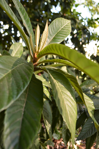 El níspero, Eriobotrya japonica, originario de China, es un árbol de porte no muy grande, puede alcanzar los 10 metros, copa globosa y tronco en general corto. Sus hojas son grandes, color verde oscuro en la parte superior, alargadas, de 30 centímetros como máximo, con bordes aserrados. Los nuevos brotes emergen de un color claro, amarillo. En el reverso las hojas tienen una pelusa que les aporta textura.