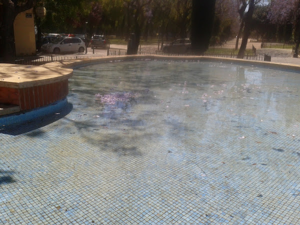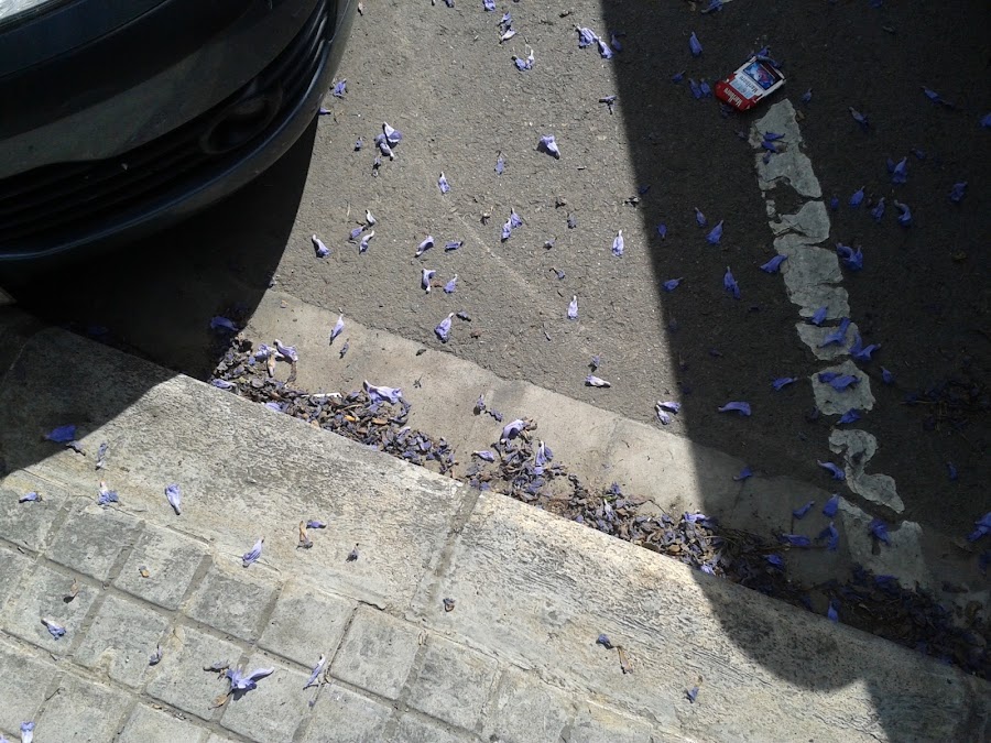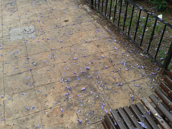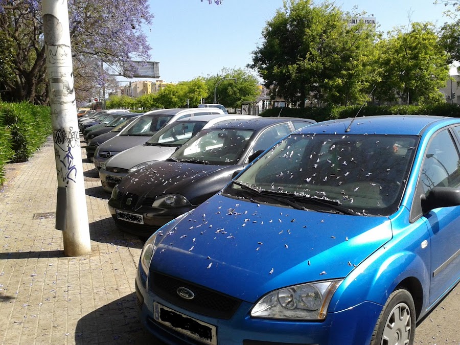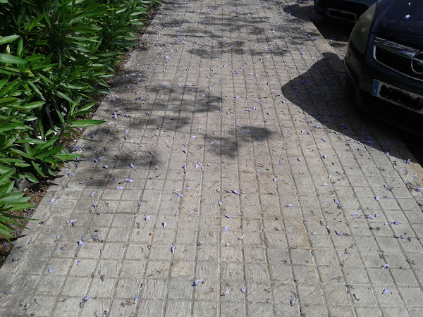 A continuación, están las flores de la jacaranda, aparte de que caen muchas flores, tiene también el principal problema de los pulgones, ya que no tratan estos arboles. Consecuencias, el suelo esta pegajoso cuando pasas bajo ellas. Parece que esta lloviendo de toda la savia que cae de los pulgones. Evitaríamos toda esta suciedad con un simple tratamiento.