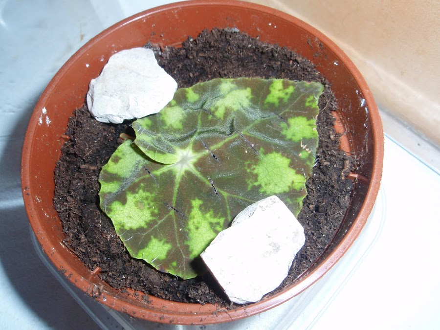 Hace unos días vi que se había roto una de las hojas y decidí experimentar, a ver si saco nuevas plantitas, lo veo difícil, pero por intentarlo... Hay que hacer unos cortes en los nervios de la hojas por el envés y ponerla en tierra con unas piedrecitas.