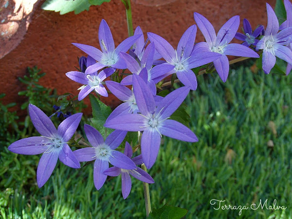 Durante todo el año mantiene un follaje verde y fresco, de rápido crecimiento. Si hace mucho calor puede marchitarse por zonas pero volverá crecer en cuanto refresque. La mía es una Campanula Garganica, variedad perenne y trepadora (y rastrera, pues se extiende por el suelo hasta encontrar una pared sobre la que extenderse). Las flores son simples, de 5 pétalos en forma de estrella y de un tono malva azulado con el centro blanco.
