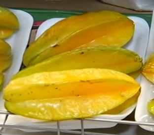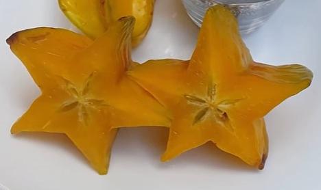 La carambola es una baya en forma de estrella de color amarillo que crece en racimos y cada fruto puede alcanzar un tamaño de 12 cm de largo. El sabor es ácido de textura crujiente en su exterior y pulposa en su interior, en donde podemos encontrar semillas marrones y planas.