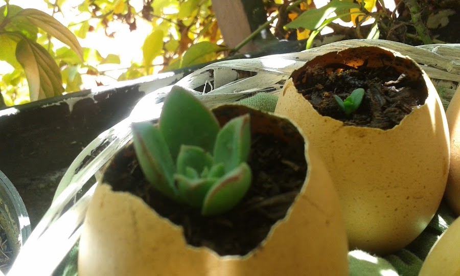 Soy amante de las plantas “bebes” y estas mini macetas quedan perfectas en mi jardín. Para esto debes abrir con mucho cuidado las cáscaras por arriba y vaciar el interior; lávalas y déjalas escurrir un poco, luego llena la cáscara con tierra y algunas gotas de agua, coloca algunas semillas (o en mi caso algunas crías de mis suculentas) y listo, ya tienes pequeñas macetas que podrás decorar como mejor quieras.