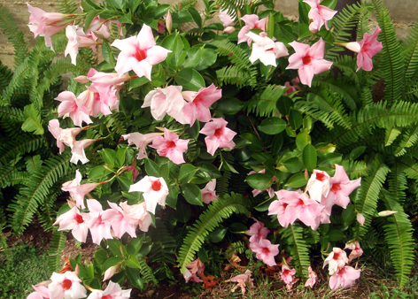 Continúan floreciendo arbustos todoterreno como las adelfas y trepadoras como el solano. También el plumbago está esplendoroso durante este mes. La mandevilla inicia su segunda floración.