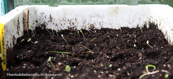 En cuanto a la lechuga estoy un poco mosca. Sembré ahí atrás de dos variedades nuevas que compré, una de ellas morada y la otra verde-rizada. De esos semilleros solo me salieron las últimas, las verdes. Al cabo de unas semanas probé a hacer otros dos semilleros más, cada uno con una variedad, y solo me salieron, otra vez, las de la variedad verde. Las moradas no quieren salir. No sé si porque las compré en mal estado, o porque no es su momento. Aún así, seguiré con mis intentos.