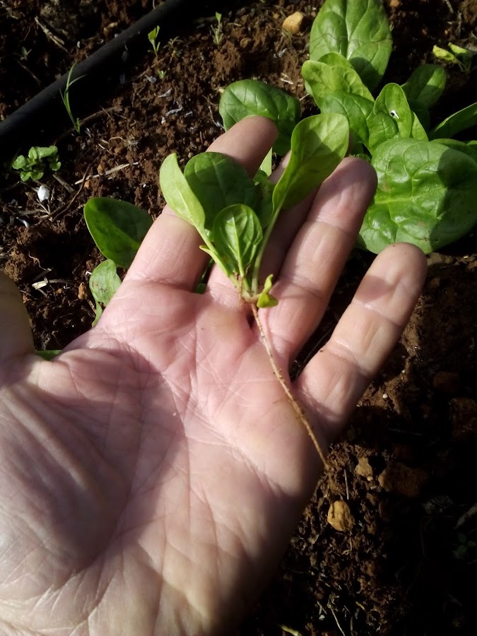 Como ya hemos comentado, con el aclareo se consigue que las espinacas que quedan plantadas gocen de más espacio y por lo tanto de mejores condiciones para que puedan desarrollarse en todo su esplendor. Además ayudamos a prevenir la entrada de patógenos debido a la acumulación de plantas. Cuando aclaramos las espinacas aprovechamos para limpiar el terreno de hierbas adventicias (escarda) posibles competidoras de las espinacas por los nutrientes del suelo.
