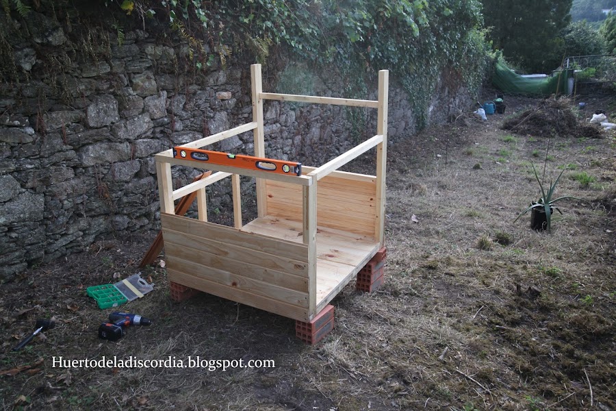 Gallinero en su ubicación finalTambién es importante, antes de montarlo entero, colocarlo es su ubicación final. Así nos ahorramos cargar con una pesada estructura. Yo opté por colocar ladrillos para separarlo del suelo. Es recomendable nivelarlo, aunque supongo que con hacerlo a ojo vale, yo opté por hacerlo con mi nivel. Me gustaría recalcar la separación del gallinero con el suelo. Si dejamos poca separación pueden criar ratas y ratones de