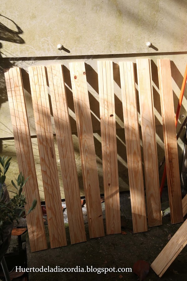 Para recubrir el gallinero en primer lugar pensé en las mismas planchas con las que les hice los ponederos, pero me parecía que iban a acabar doblándose por la lluvia, después de todo esto es Santiago de Compostela, por lo que lluvia no falta. En cambio sí opte por estas planchas para hacer el suelo. Con una me bastó, sobrándome un pequeño trozo. Las medidas de la plancha de madera son 2m x 60cm, por lo que la corté a la mitad, haciendo dos de 1m x 60cm. Luego hay que cortarle las esquinas, para ajustar con los listones y restarle un poco del ancho, pero lo hice ajustando en el sitio, sobrándome 20cm aprox.