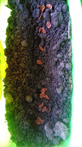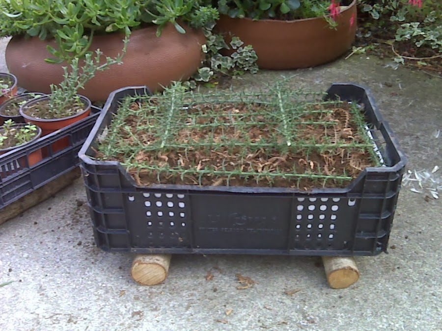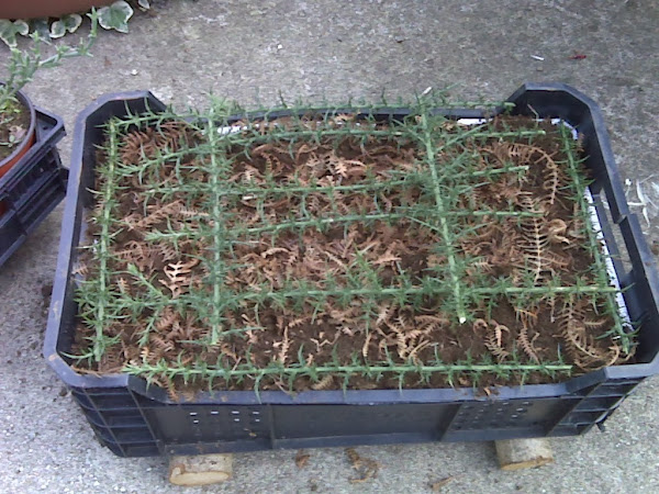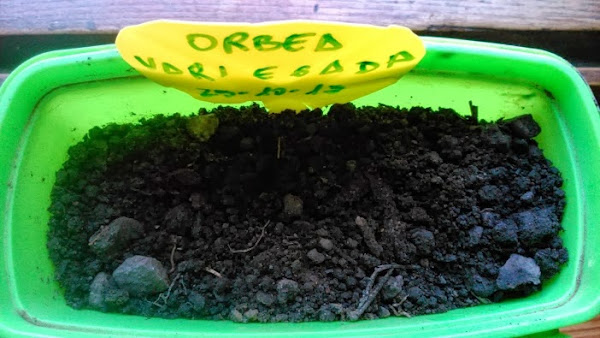 sembré una vaina completa de Orbea, tapé las semillas espolvoreando por encima un poco de tierra y cubrí la superficie con helecho seco para ahuyentar a las mariposas y espinos para mantener a raya a los gatos (que son muy aficionados a investigar los semilleros)