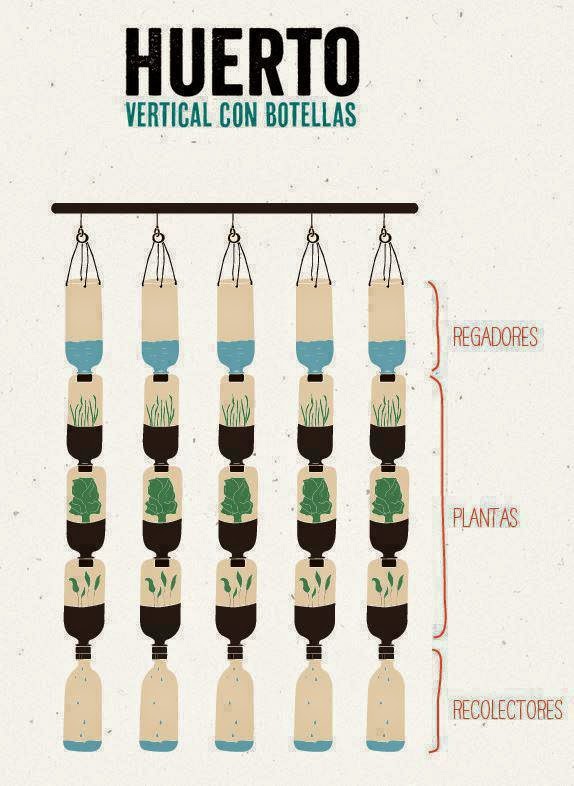 Respetando que las botellas de arriba se utilizan para el riego y las de abajo para la recogida del drenaje de las plantas, se pueden intercalar entre estas dos tiras, varias hileras donde poder cosechar las plantas que creamos oportunas.