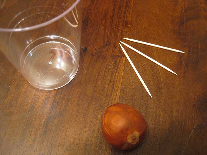 A continuación, le clavaremos a nuestro hueso de aguacate 3 palillos y lo dejaremos en un recipiente suspendido en el agua, nos tendremos que asegurar que toda la parte inferior de este queda sumergida. También nos aseguraremos de que el hueso esté hacia el lado correcto puesto que la parte del hueso que tiene que quedar hacia arriba tendrá que ser puntiaguda y, la inferior, más plana, una comparación sencilla sería la forma de un huevo.