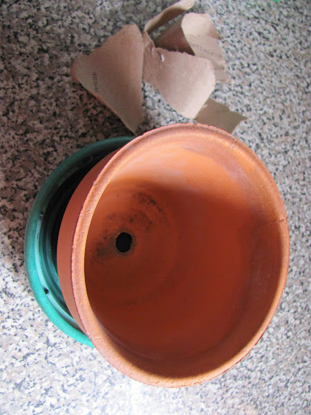5.- Cuando hayan pasado aproximadamente unos 8 o 10 dias, el nuevo rebrote de apio estará listo para pasarlo a una maceta. Esta maceta no deberá ser muy grande. Yo conseguí una maceta de barro para hacer la siembra. Siempre acostumbro poner algunas piedras o trozos de barro o ladrillo, o incluso trozos de cartón en el fondo de la base de la maceta, para que el drenaje no se obstruya una vez que se coloque la tierra negra. Incluso las bases perforadas de las macetas de plastico sirven para este fin, las he cortado como a 1 cm de alto y las pongo volteadas en el fondo de la base para que continue libre el drenaje de la maceta.