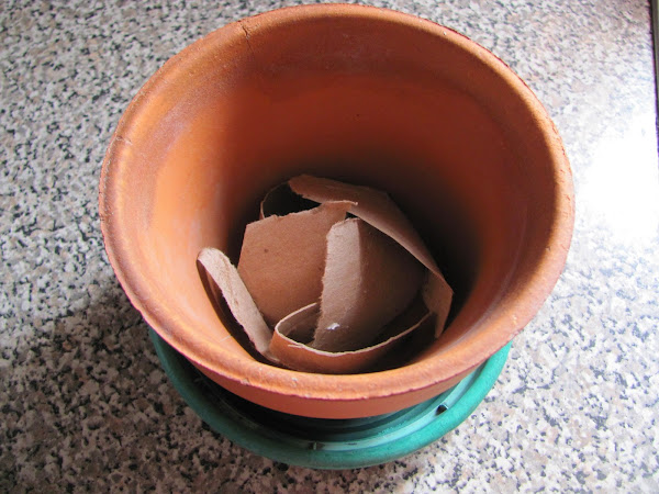 6.- Aqui se puede apreciar lo que explico en el paso anterior. He colocado trozos de cartón en el fondo de la maceta para dar mas libertad al drenaje cuando la planta se riegue.