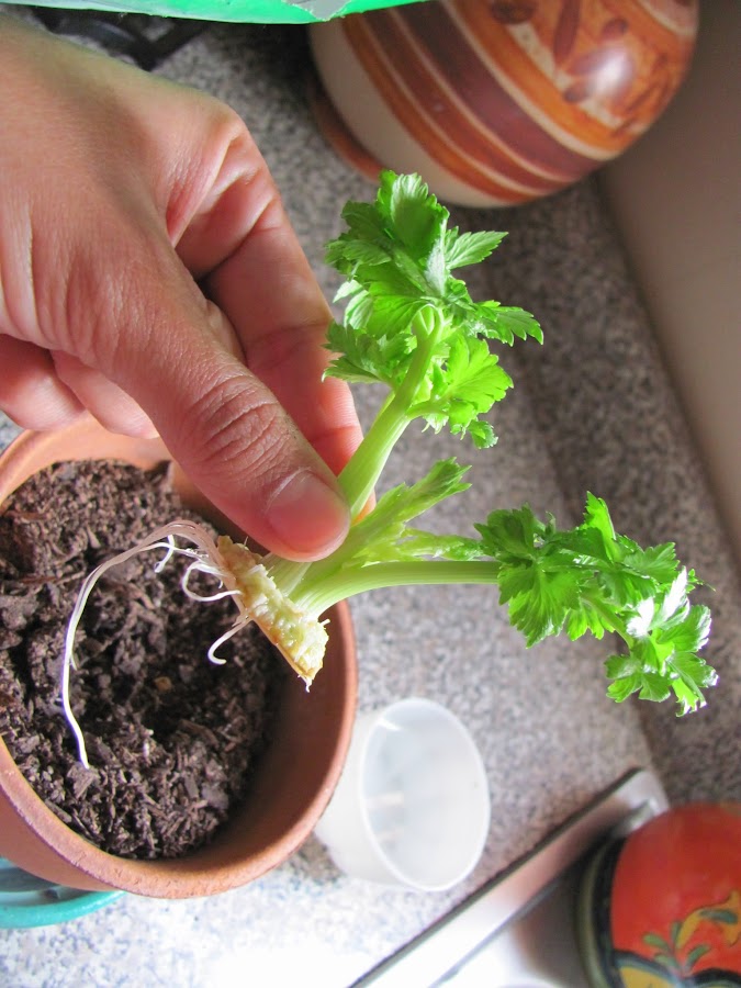 7.- Para cuando hayan paso los 8 o 10 dias, nuestro rebrote de apio ya tendrá algunas raices. Aqui podremos arrancar con cuidado, todos los tallos que tenga alrededor para dejar solo los nuevos, tal y como se observa en esta imagen. Este es el momento de sembrar nuestra nueva plantita de apio. Cuando la hayamos sembrado, procurar aplanar bien la tierra de alrededor para no dejar burbujas de aire que puedan afectar las raices nuevas. Regamos con cuidado, y tratamos de mantener humeda esta tierra en el transcurso de los dias, siempre verificando, al momento de regar, que el drenaje sea fluido.