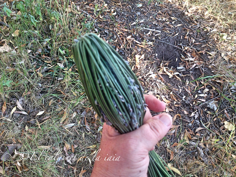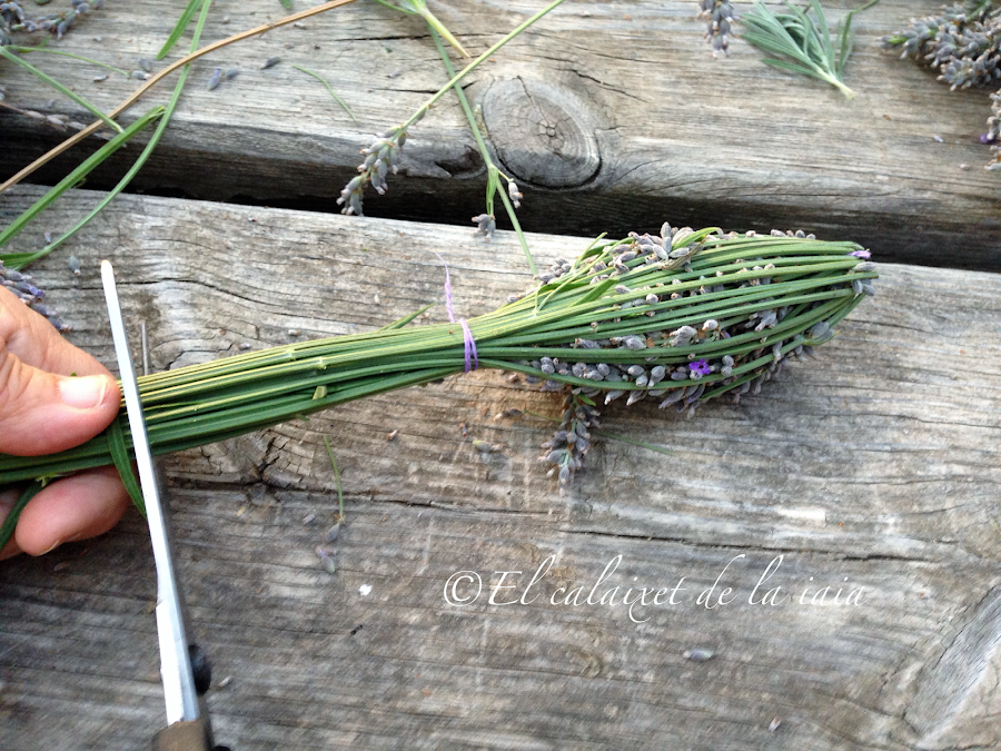 Comenzaremos por asear cada vara de espliego eliminando las hojitas que hayan en el tallo sujetando cada vara con una mano y tirando de las hojitas hacia abajo, veréis que es facil y rápido