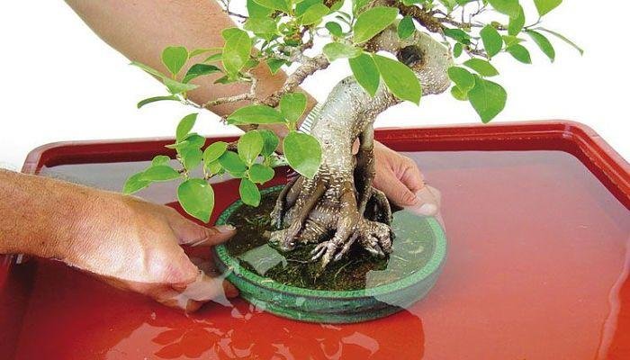 Coloca el bonsái en un envase grande tipo baño María. Coloca agua que llegue más de la mitad del tiesto de árbol para que el agua entre por los agujeros de drenaje para que la tierra llegue al punto de saturación. Sácalo luego de haber remojado de 15-20 minutos.
