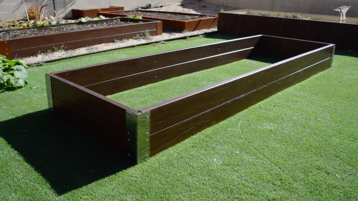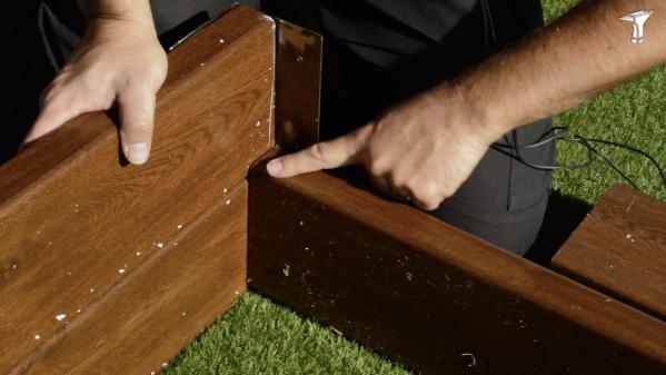Una vez tengas las dos paredes cortas del bancal montadas cada una con sus dos esquinas, puedes colocarlas en su sitio y comenzar a atornillar las piezas largas.