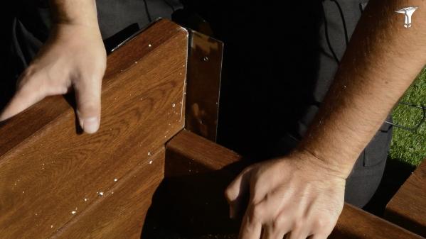 Comienza colocando las piezas trasversales, o sea las cortas, sobre una mesa. Colócalas juntas y alineadeas con el extremo en el borde de la mesa. Así podrás poner las escuadras perfectamente.Coloca la escuadra sobre los perfiles apoyándola por el lado corto.