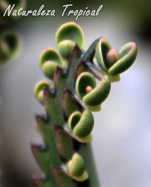 Plántulas generadas en el borde de las hojas de una planta suculenta, Kalanchoe daigremontiana