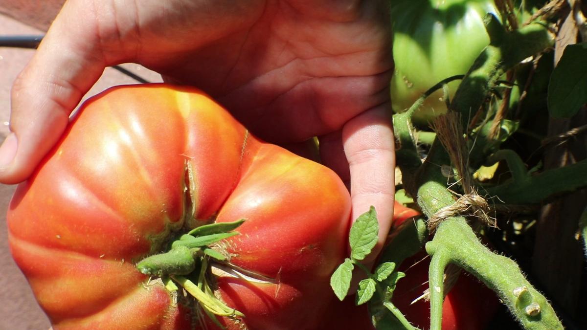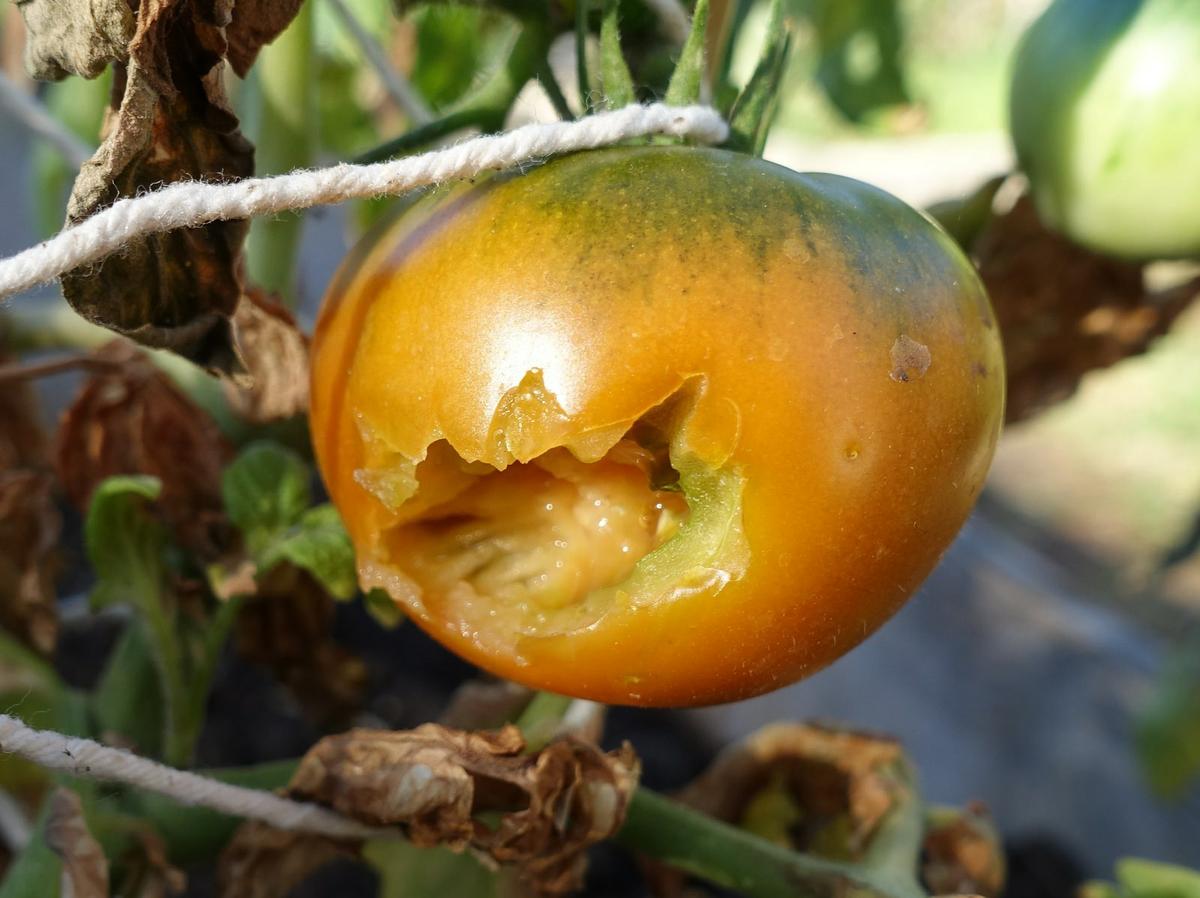tomate agrietado por demasiada agua luego de sequía • Otro tema que hay que tener en cuenta es que cuando las temperaturas son superiores a los 30 grados, los tomates no van a ponerse rojos en la planta, y van a pasar del verde al rosa y si los dejamos mas tiempo se van a terminar pudriendo.