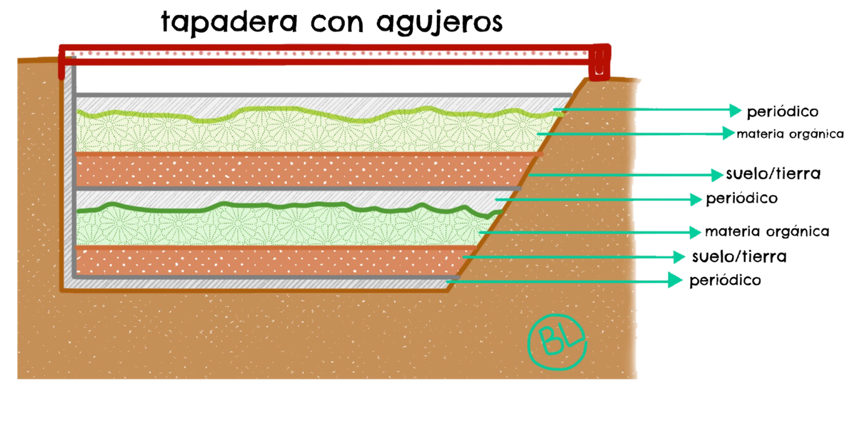 ¿Necesitas aún más? Entonces es momento de ir a nuestro huerto, en un lugar cerca de una pared haz un agujero de al menos 1 metro cuadrado y de profundidad unos 30 cm (puedes hacerlo más pequeño) con la misma pala o tus pies aplasta la tierra, tanto la base como las paredes, hecho eso coloca periódico cubriendo perfectamente (compactar el suelo y el periódico te ayudarán a que se note más la separación de tu suelo normal a donde haces el compost) y rellena cómo se ve en la imagen ; cubre con un plástico de preferencia negro para que retenga más el calor o con alguna tapadera que tengas disponible, solo procura que tenga una entrada de aire para que se realice el proceso.