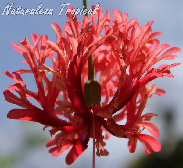 Las flores son muy hermosas y aparecen con frecuencia en las etapas más calurosas del año (verano fundamentalmente). Estas tienen una morfología muy peculiar que las diferencian de otros hibiscos; sus pétalos (5 en esta especie) son muy irregulares y están muy divididos en diferentes lóbulos. Los colores de la corola son variables aunque el color más frecuente es el rojo (pueden existir flores con pétalos rosados o anaranjados). En esta especie los pétalos se encuentran plegados hacia atrás y se observan proyectados hacia adelante, las estructuras reproductoras (estambres y estigma). Todas las flores son sostenidas por un delgado tallo floral que las orienta apuntando hacia el sustrato.