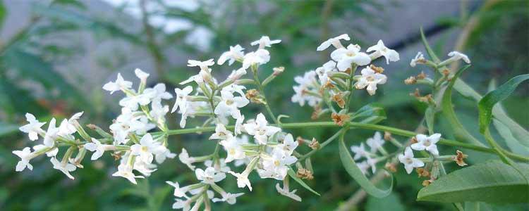 Sus flores son blancas y pequeñas, muy parecidas a las del jazmín. Éstas emiten un potente aroma que nos recuerda a frangancias de cítricos (especialmente del limón) que impregnan todas las noches del jardín en época estival.