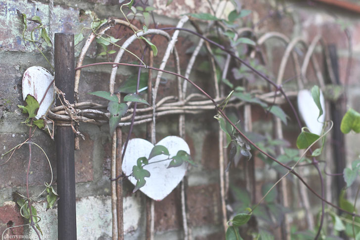 Dos tubos y un trenzado nos han dado una celosía, el trenzado puede ser sustituido por unas maderas transversales, lo que realmente le da el toque original, son los corazones colgados, que pueden ser realizados fácilmente con estaño, y luego pintar.