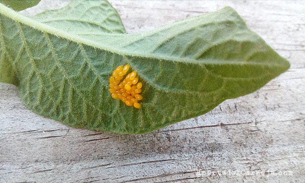 Huevos. Una semana después las hembras ponen huevos en grupos de 10 a 30, en el envés de las hojas. Tienen preferencia por las hojas de las patatas pero hemos observado puestas frecuentes en las berenjenas y en una adventicia, el Solanum nigrum o tomatito que es muy frecuente en al huerta. Los huevos son ovalados, miden 1,5 mm, se adhieren a las hojas y son de color amarillo/anaranjado. Cada hembra puede poner hasta 400 huevos.