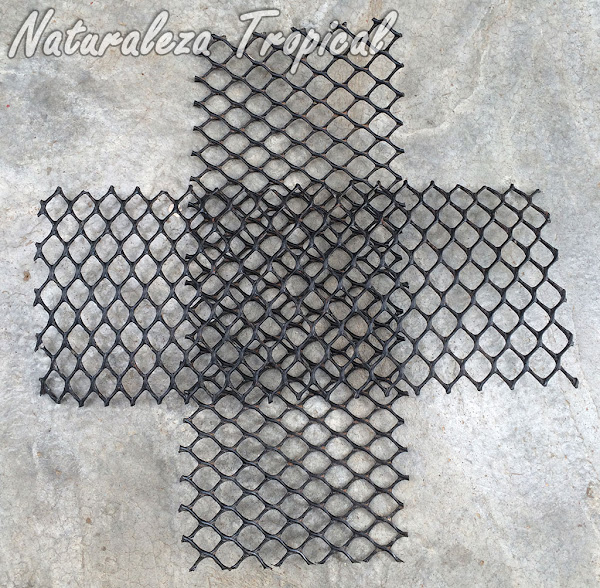 1- Lo primero que debemos hacer es colocar un trozo de rejilla plástica sobre la otra formando una cruz, el centro de la cruz será la base de la maceta.