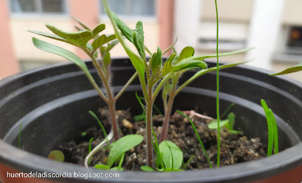 La tomatera es una planta maravillosa. Hay veces que da muchos problemas, sobre todo esos años que empieza a coger lo que en algunas zonas de Galicia llaman pestes y que no viene siendo otra cosa que hongos. Pero la verdad es que crece que da gusto y sin duda es una de esas plantas que le da a un huerto una estética de calidad. Por supuesto que no estamos aquí para que nuestro huerto sea bonito, pero da gusto pasear y ver esas plantas llenas de tomates. Y esa planta maravillosa en mi cultivo de emergencia es la que se lleva la medalla al crecimiento. Ha salido en todas las macetas, producto de compostar los restos vegetales en la vermicompostadora. Pero sinceramente no me importa que salgan por doquier. Eso me permite la selección. Los dejo crecer un poco y los que despunten de manera clara serán los que se queden en la maceta.