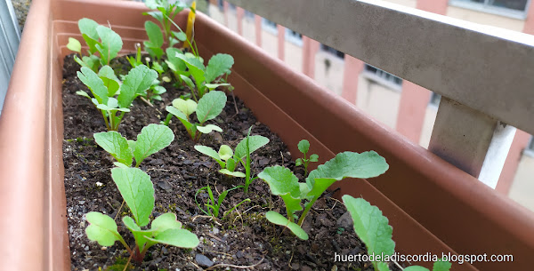Los rábanos ahí van. La verdad es que debe hacer unos 8 años que no plantaba rábanos. Me da la sensación de que uno se me está espigando un poco. Pero como hace tanto que no los planto la verdad es que no me acuerdo bien como se desarrollaban. Tengo que clarear la maceta y eliminar competencia. Lo he estado postergando un poco para estar seguro. Me daría rabia que para unos pocos rábanos que he plantado se me espigue uno. Los sembré el día 14 de marzo. Ha pasado un mes y una semana aproximadamente. De momento creo que van bien, pero dentro de la maceta hay diferentes alturas. ¿Será por la inclinación que tiene en el alféizar de la ventana?.