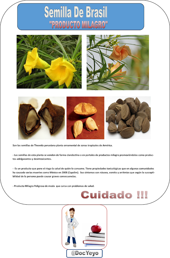- Es una planta tóxica, todas sus estructuras, desde las hojas, las flores hasta las semillas contienen varias toxinas con efectos gástrico y cardiacos. Resultado de sus componentes como la Tevetina, peruvósido, Cerebrina o ácido cianhídrico (goo.gl/62ZUBb)