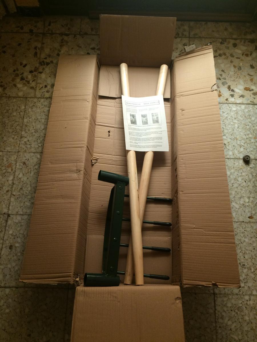 La herramienta viene desmontada y bien embalada. El paquete consta de 2 palos de madera de haya, de una largura de 109 cm. Una cabeza de herramienta con púas soldadas de 26 cm de largura. Un bolsita de dos tornillos para fijar los palos una vez insertados en el cabezal. Una hoja de instrucciones de uso. ( La hoja viene en francés, pero si alguien no sabe francés, tiene dibujitos para entenderla ).