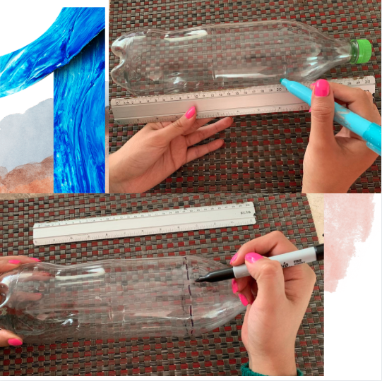 Toma la botella y medir 20 cm de abajo hacia arriba. Vas a hacer unas marcas con el plumón alrededor de la botella para indicar esta medida.Paso 2: