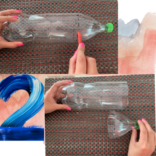 Corta la botella en la marca que hiciste anteriormente. Y separa la parte de arriba con la de abajo. Si es necesario puedes recortar los borde con tijeras para que quede derecho el corte.Paso 3: